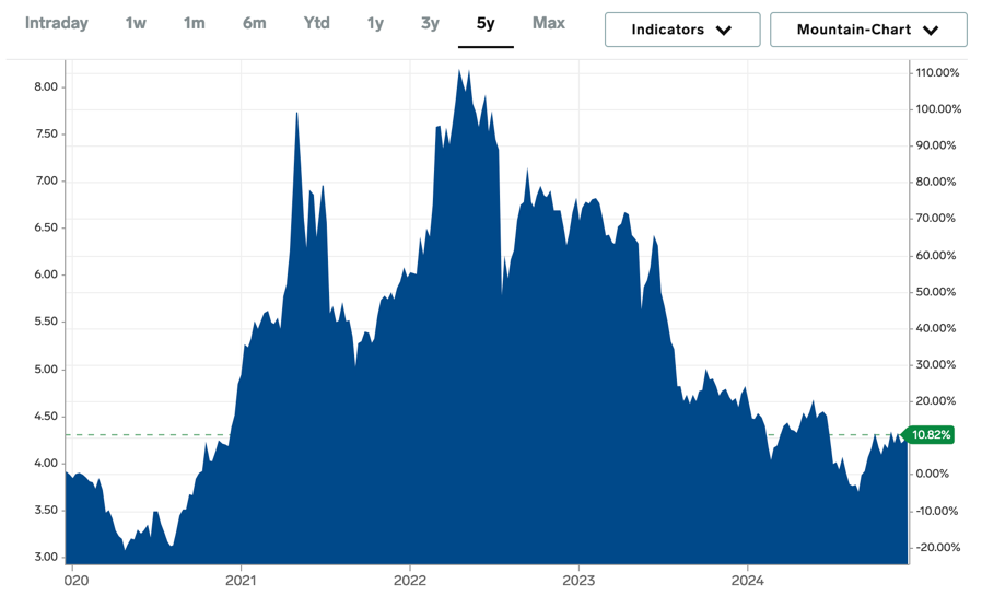 As an example, the below graphic represents the price of corn commodities in the US market over a five-year period. The mountainous nature of the graphic showcases the potential for significant price swings that impact markets in a very real way. In 2022, the price of corn had such a spike up to $8, double where it stands today. Such a swing causes both economic disruption and real tensions on the ground when corn and corn products are much higher priced or not available at all.