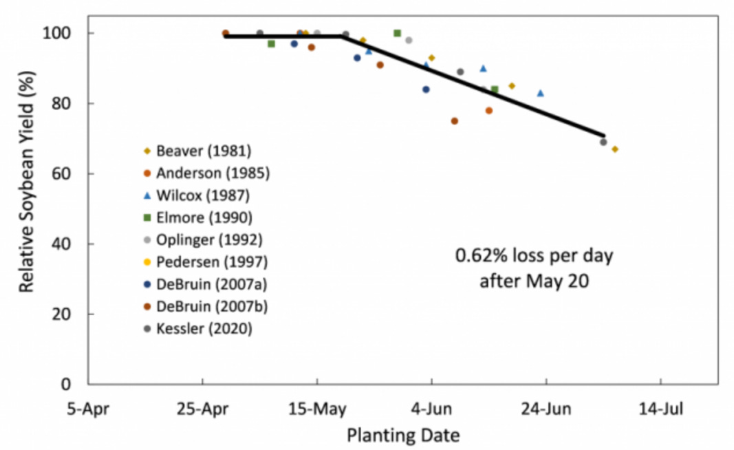 The story is the same for soybeans. According to the same study, the optimum window for soybean planting is between April 11th and May 20th. The earlier planting can increase yields up to 3-4 bushels per acre with a fall off throughout the planting season and a steep decline beyond May 20th.
