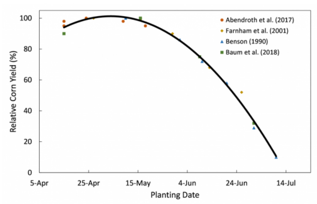 According to Iowa State University, the optimum planting window for corn presents an interesting trend. While the best planting times April 11th – May 18th, the expected relative yield decreases at a rapid rate after May 18th as shown in the graphic below.