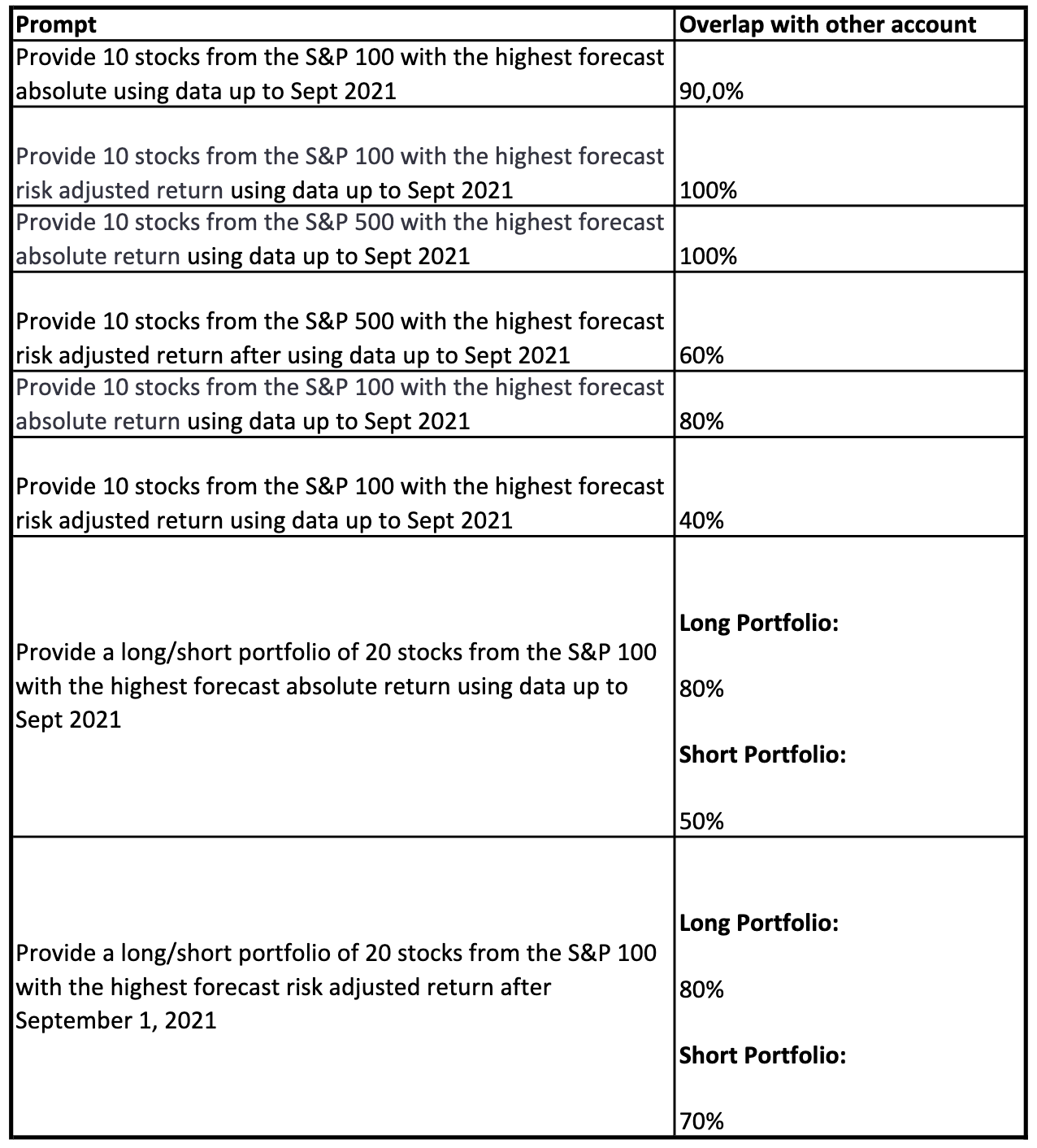 Below is a table that provides the percentage of stocks common to two different ChatGPT sessions, on two different computers.