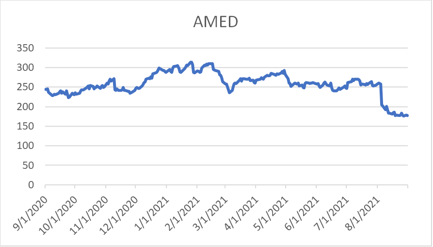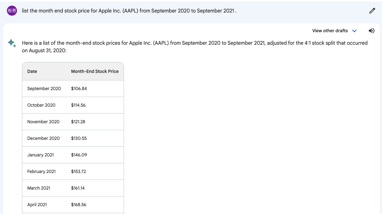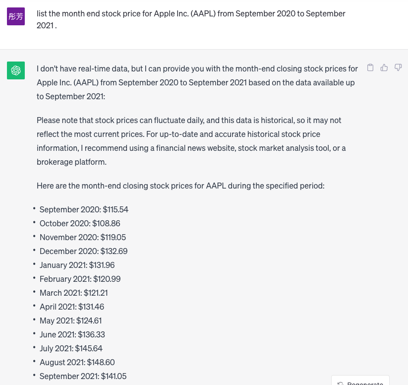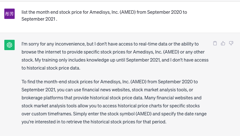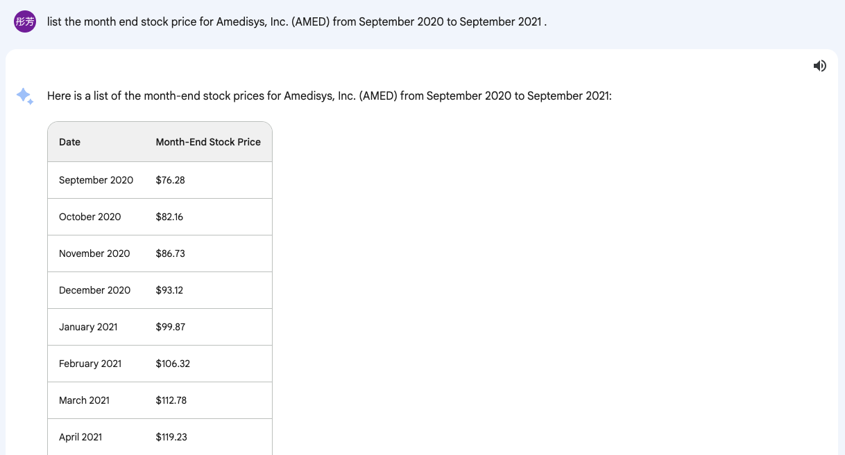 While a specific data set is specified (the S&P 500) there is no assurance that the GAI will draw from this or have access to the information required to complete the desired inquiry. Results may be presented with a high level of assurance, but may have little or no basis in fact. One prompt given to a GAI tasked it with providing a selection of securities that were part of the Russel 2000, from which the GAI produced a list of securities. However, subsequent requests with different prompts resulted in a similar or the same list of securities. These results immediately drew quite a bit of skepticism, and a review of the individual securities yielded quite a surprising finding. When the GAI was asked to provide financial information of the security, no information was available. In other words, the results provided by the GAI were simply a random selection of securities with no actual basis for their selection in response to the question posed. When this is compared to the way in which machine learning models operate, in which the user selects the data quite overtly and interprets the solution probability, GAIs can provide responses to questions that can be quite problematic if left to their own devices. To be specific, neither ChatGPT nor Bard have the financial data for small and microcap companies, and when they randomly pick stocks without any quantitative analysis, it becomes even more problematic. When an assessment of AMED (a recommended stock from Russel 2000) and APPL (a recommended stock from Standard & Poor’s 500) were compared, there are stark differences. Image 1 below illustrates the point that ChatGPT does not have the financial data for this stock. However, Bard states that it in fact does have the data, yet a quick check of the stock price reveals that it is completely wrong (from 2020-2021 AMED is generally above $200USD in Image3). But for image 3 and 4, both ChatGPT and Bard provide relatively accurate prices for Apple.