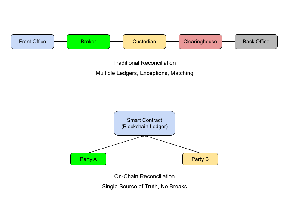 In traditional financial markets, trade reconciliation is a critical but complex process. Every security trade requires multiple independent parties—front office, broker, custodian, clearinghouse, and back office teams—to exchange files, confirm details, and ensure that what was intended to be traded matches what was executed and ultimately settled. This workflow involves numerous handoffs, reconciliation points, and exception management steps, all designed to align the “truth” across disparate ledgers.
